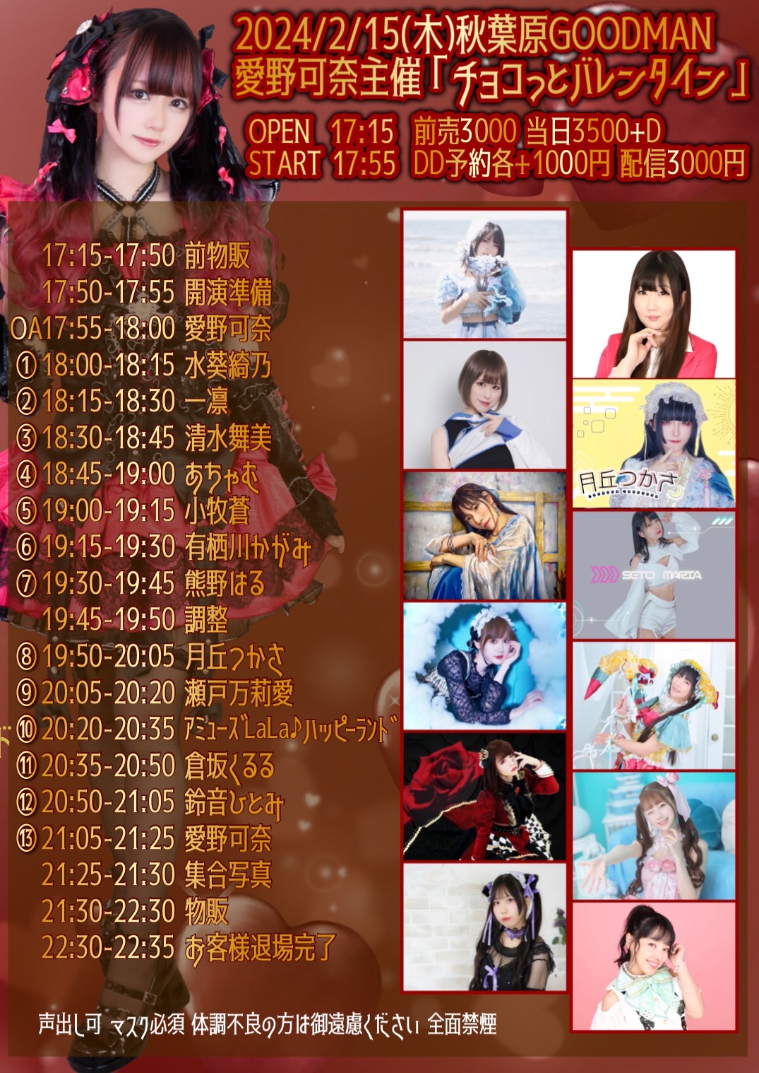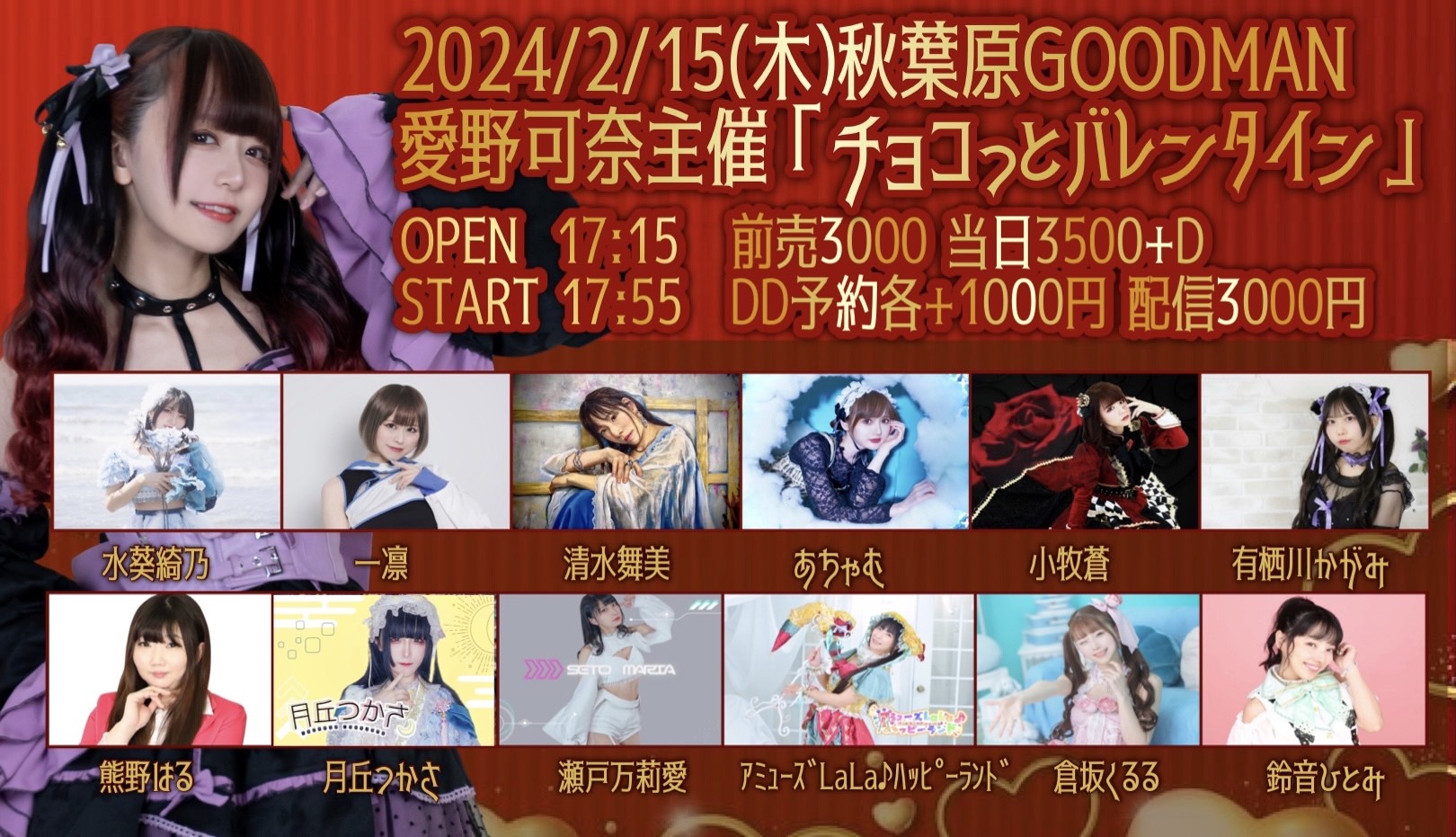 出演者 愛野可奈 倉坂くるる 一凛 あちゃむ 瀬戸万莉愛 有栖川かがみ 鈴音ひとみ アミューズLaLa♪ハッピーランド 水葵綺乃 小牧蒼 熊野はる 清水舞美 月丘つかさ OPEN 17:15 / START 17:55 前売3000円 当日3500円+D DD+1000円 配信3000円