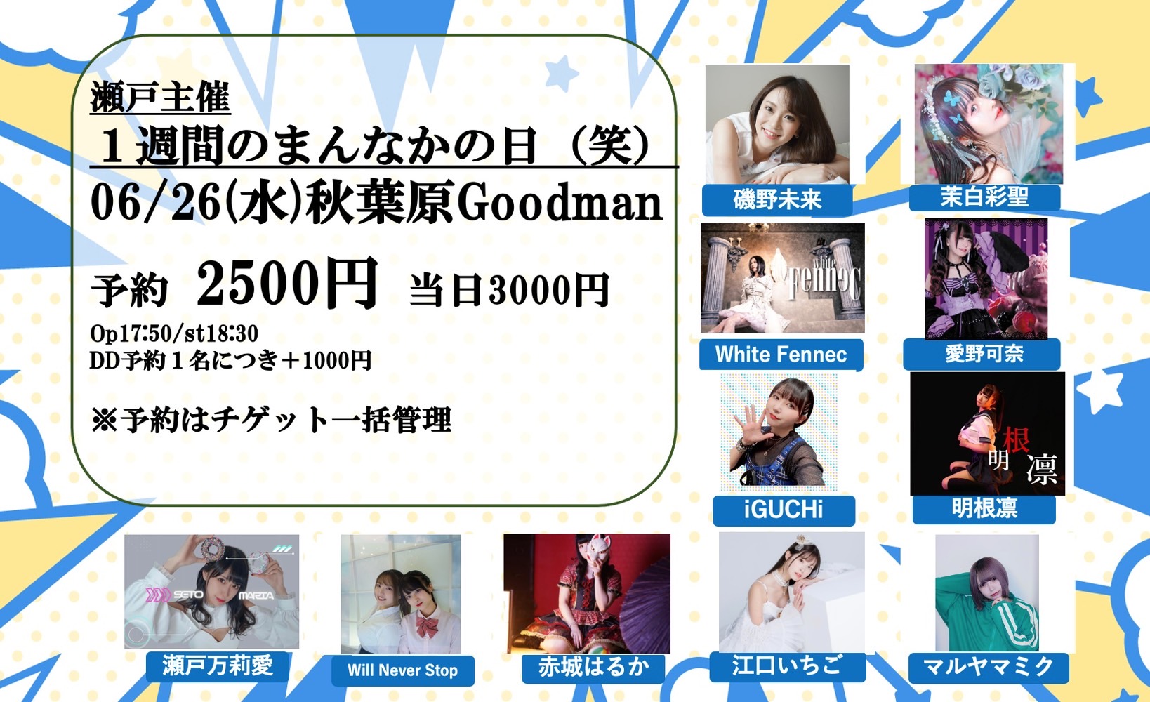 出演者 瀬戸万莉愛 愛野可奈 マルヤマミク 茉白彩聖 明根凛 江口いちご 磯野未来 iGUCHi White Fennec Will Never Stop 赤城はるか OPEN 17:50 / START 18:30 前売¥2,500 当日¥3,000 ドリンク代別¥600 DD+¥1,000