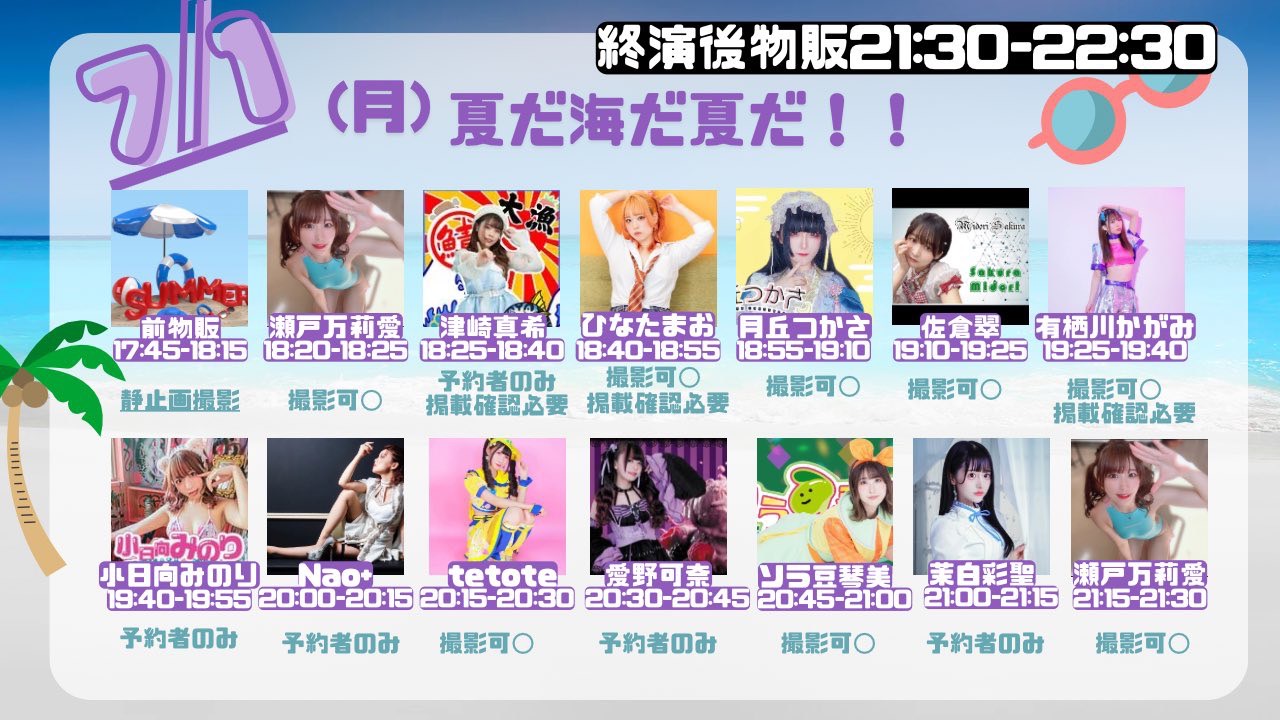 出演者 瀬戸万莉愛 Nao+ 愛野可奈 有栖川かがみ 茉白彩聖 ソラ豆琴美 月丘つかさ ひなたまお 小日向みのり 佐倉翠 津崎真希 tetote OPEN 17:45 / START 18:20 前売¥2,900 当日¥3,400 ドリンク代別¥600 DD予約+¥1,000