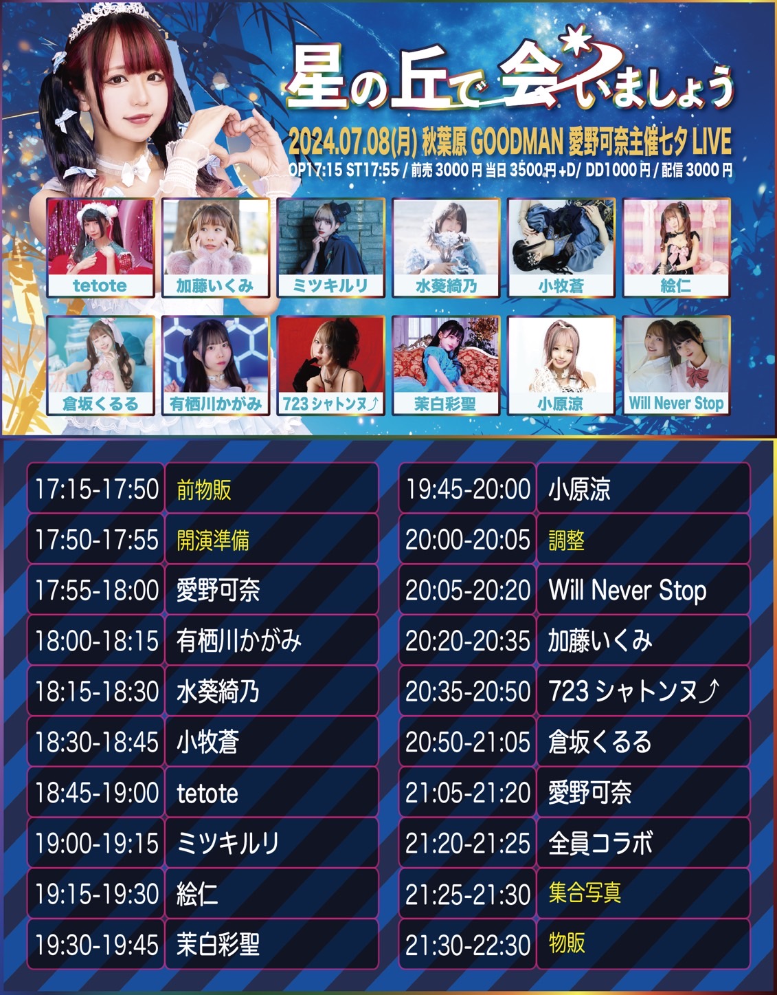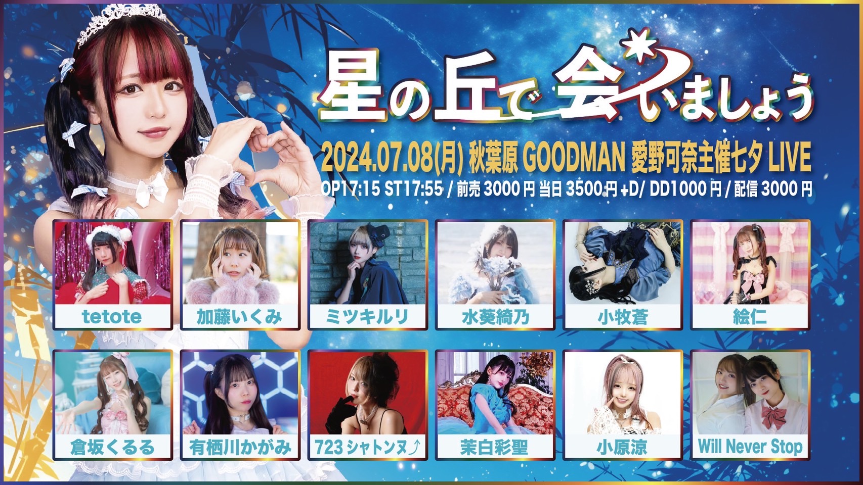 出演者 愛野可奈 有栖川かがみ 倉坂くるる 茉白彩聖 小原涼 水葵綺乃 723シャトンヌ⤴ ミツキルリ 小牧蒼 tetote 加藤いくみ Will Never Stop 絵仁 OPEN 17:15 / START 17:55 前売3000円 当日3500円+D DD+1000円 配信3000円