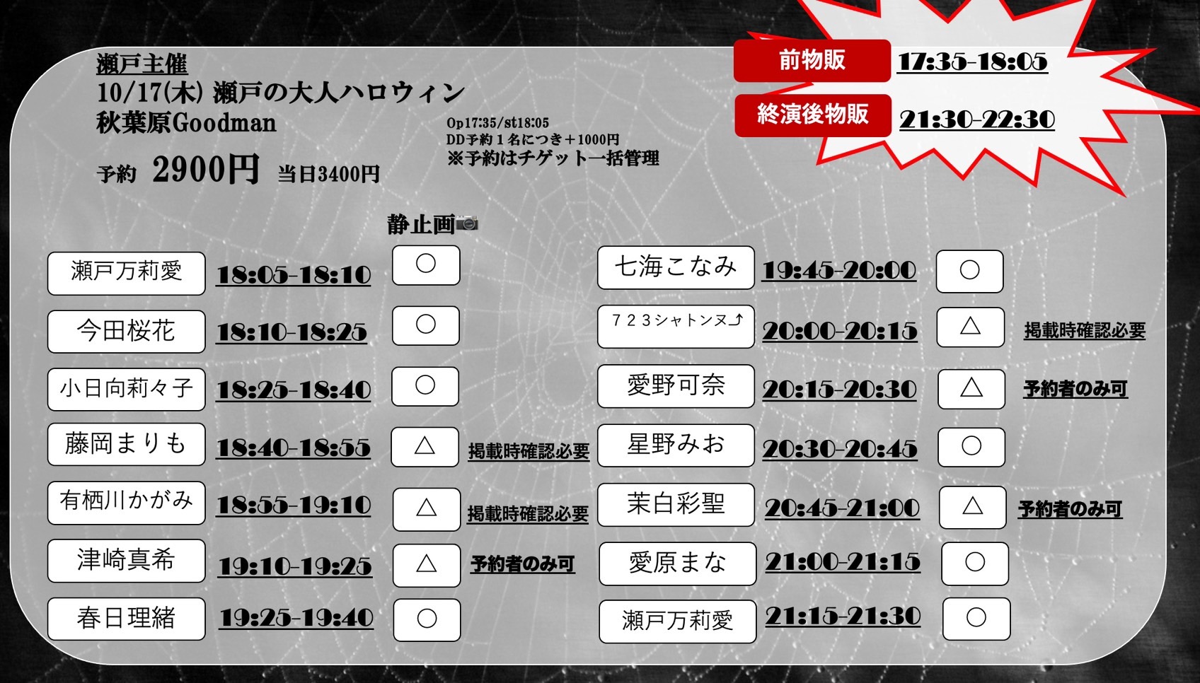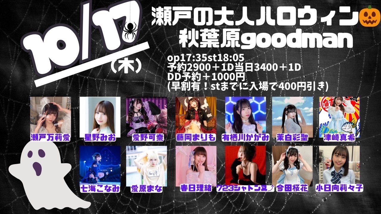 出演者 瀬戸万莉愛 茉白彩聖 愛野可奈 藤岡まりも 津崎真希 有栖川かがみ 七海こなみ 愛原まな 春日理緒 小日向莉々子 723シャトンヌ⤴ 星野みお 今田桜花 OPEN 17:35 / START 18:05 予約¥2,900- 当日¥3,400-ドリンク代別¥600 DD予約+¥1,000-