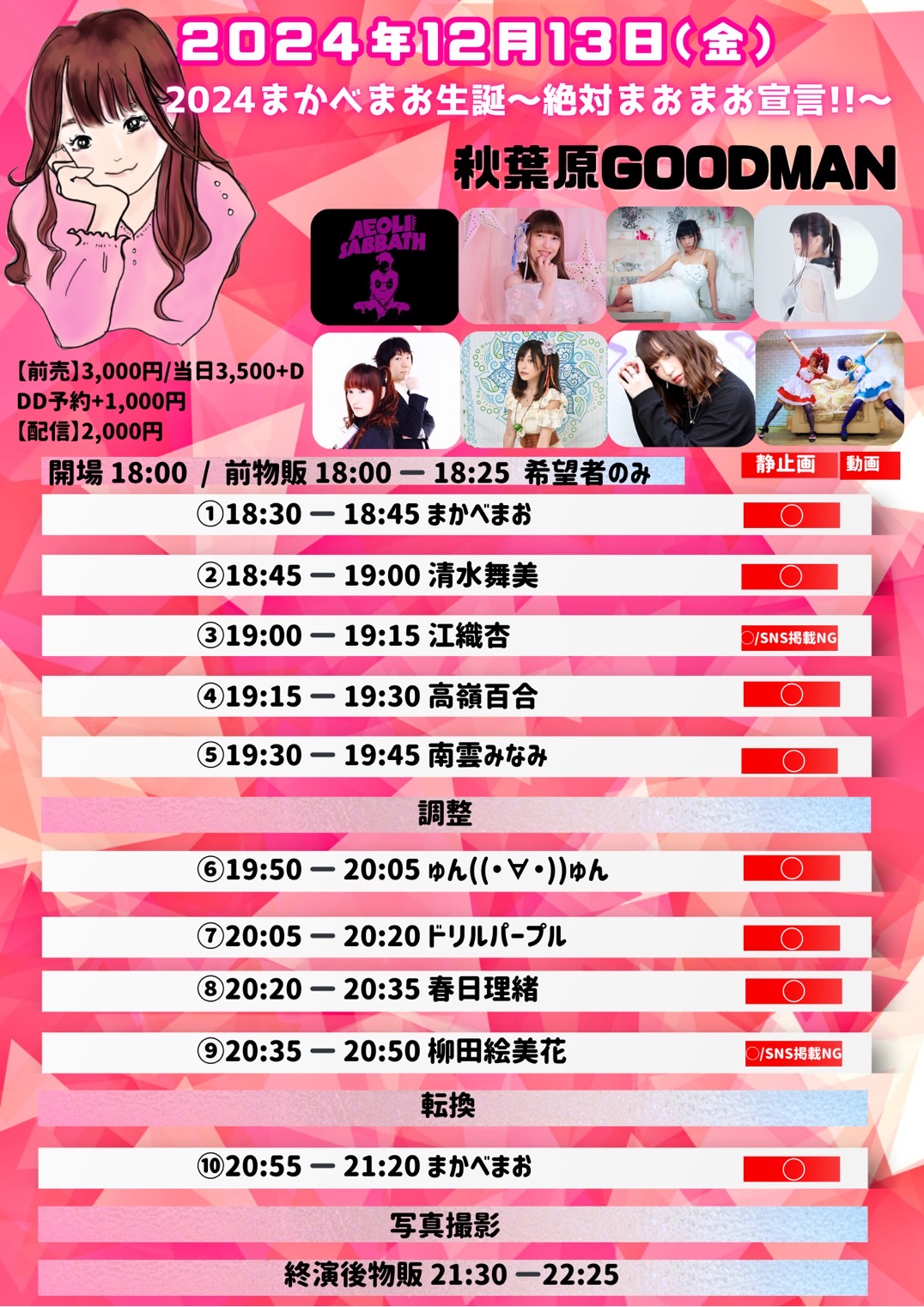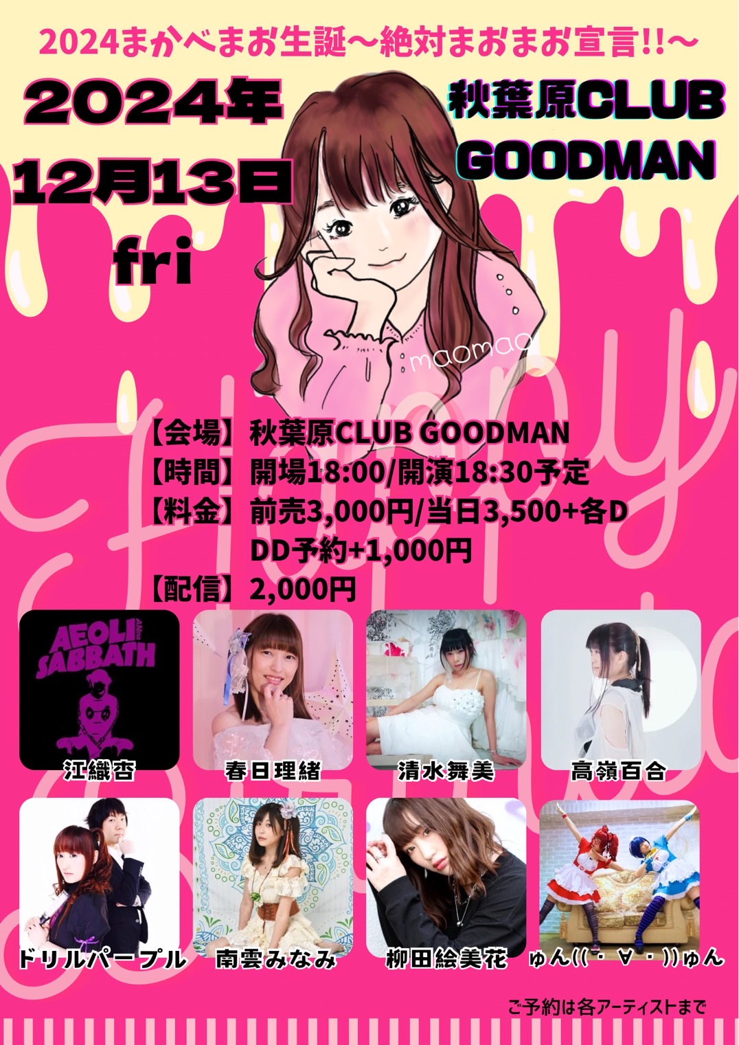 出演者 まかべまお 江織杏 春日理緒 清水舞美 高嶺百合 ドリルパープル 南雲みなみ 柳田絵美花 ゅん((・∀・))ゅん OPEN 18:00 / START 18:30 前売3,000円+1D DD予約+1,000円 【配信】2,000円