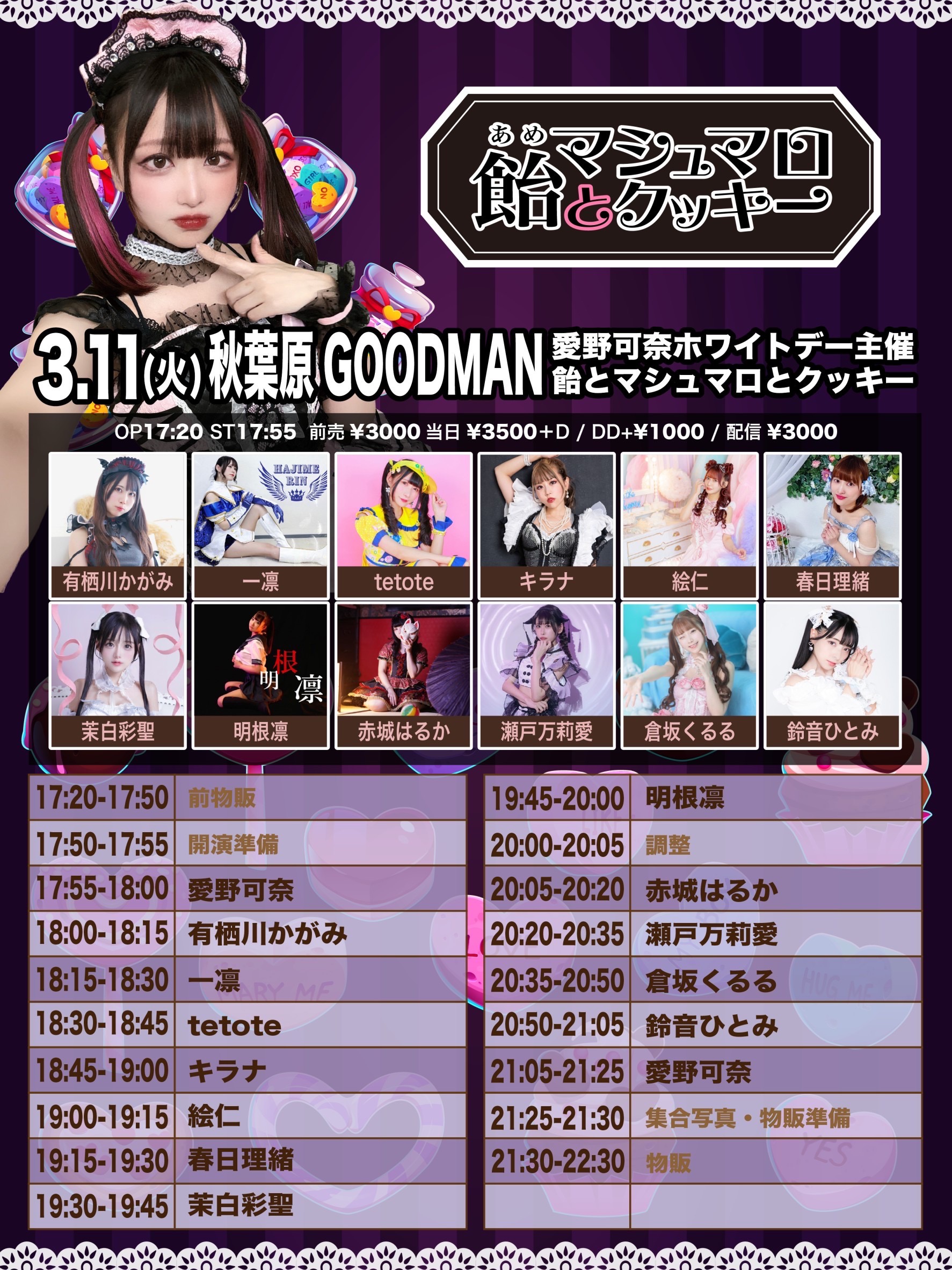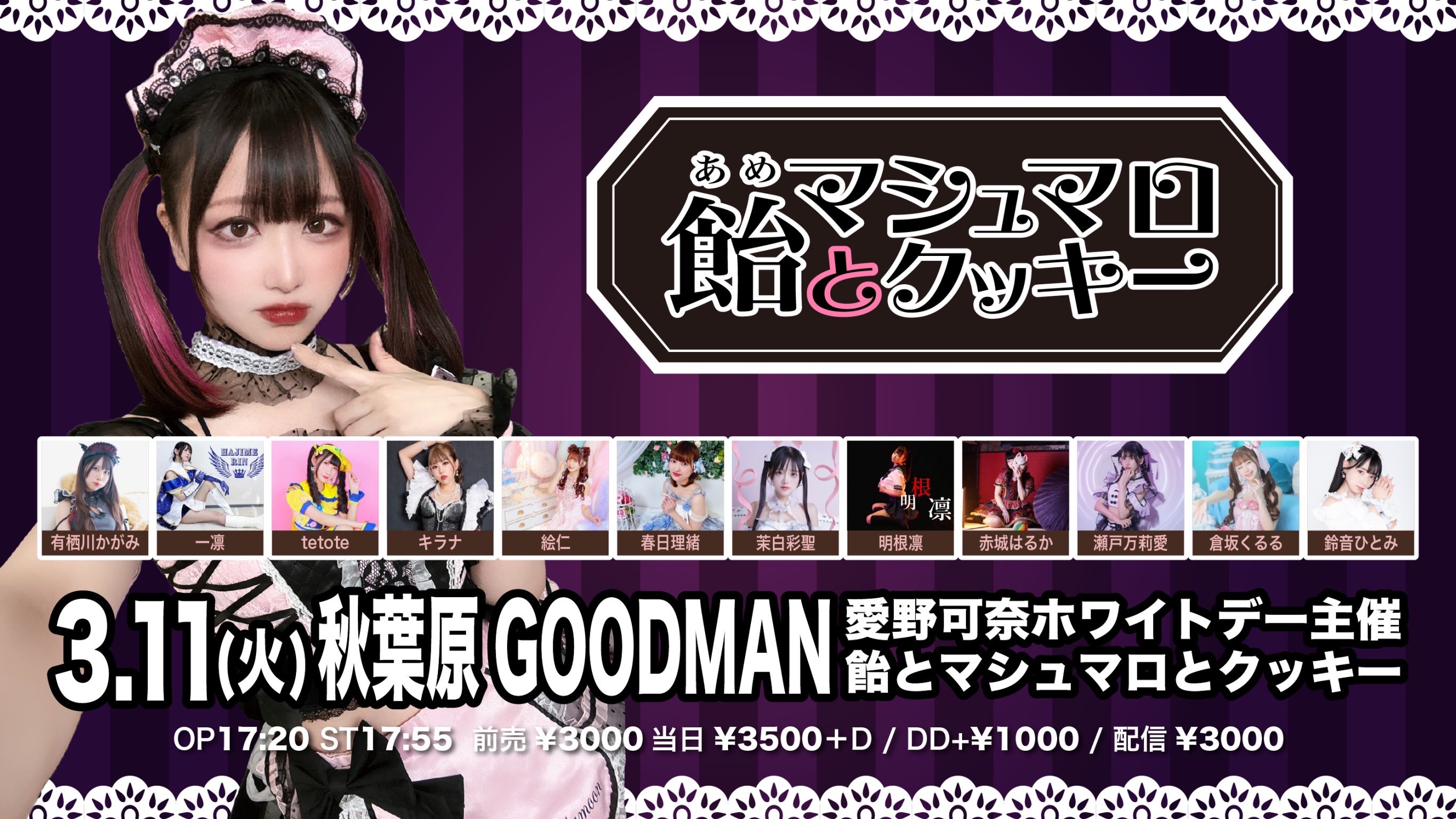出演者 愛野可奈 瀬戸万莉愛 明根凛 春日理緒 茉白彩聖 鈴音ひとみ キラナ 倉坂くるる 赤城はるか tetote 有栖川かがみ 絵仁 一凛 OPEN 17:20 / START 17:55 前売¥3000当日¥3500+D DD予約+¥1000