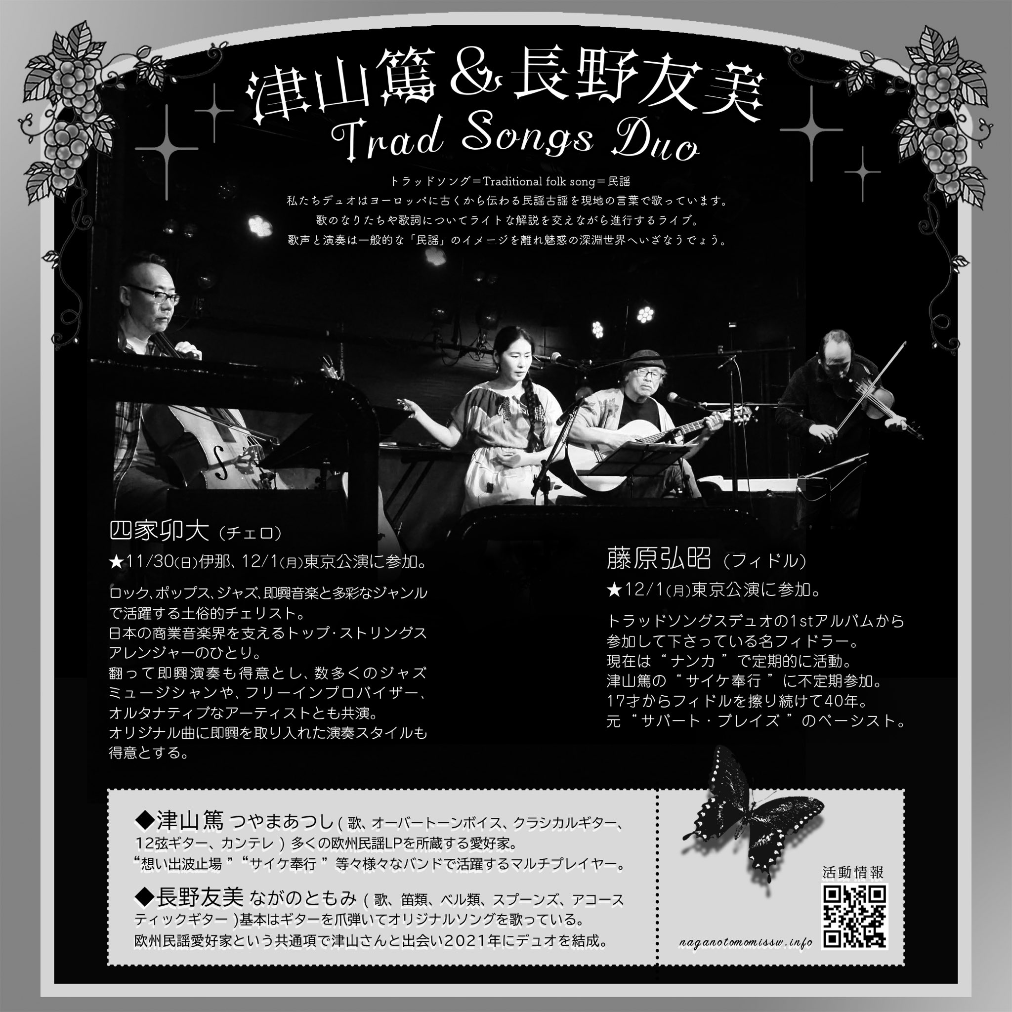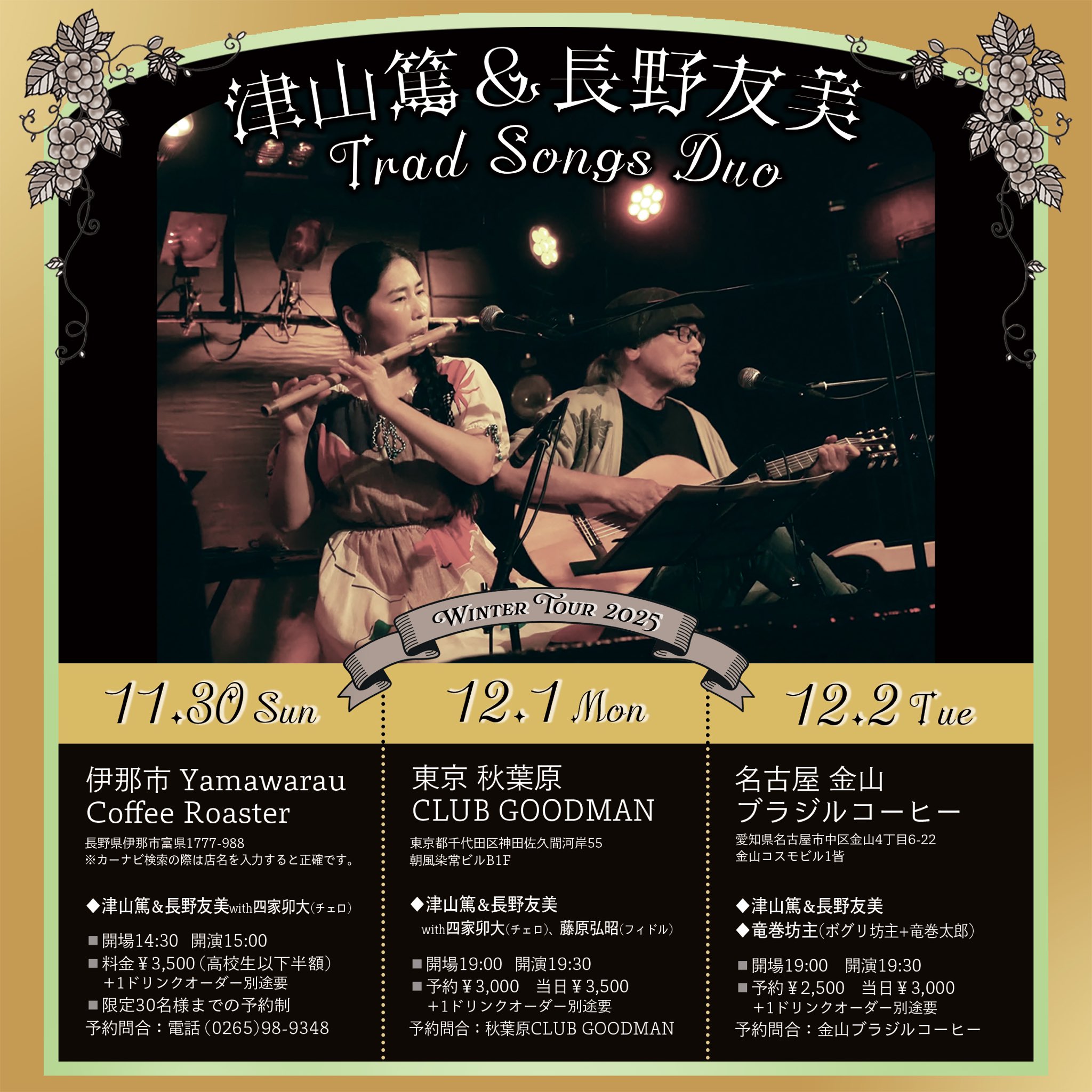 2025.12.1(月) ”津山篤&長野友美トラッドソングスデュオwith 四家卯大(チェロ)藤原弘昭(フィドル)” 前売り3000円当日3500円 開場19:00開演19:30