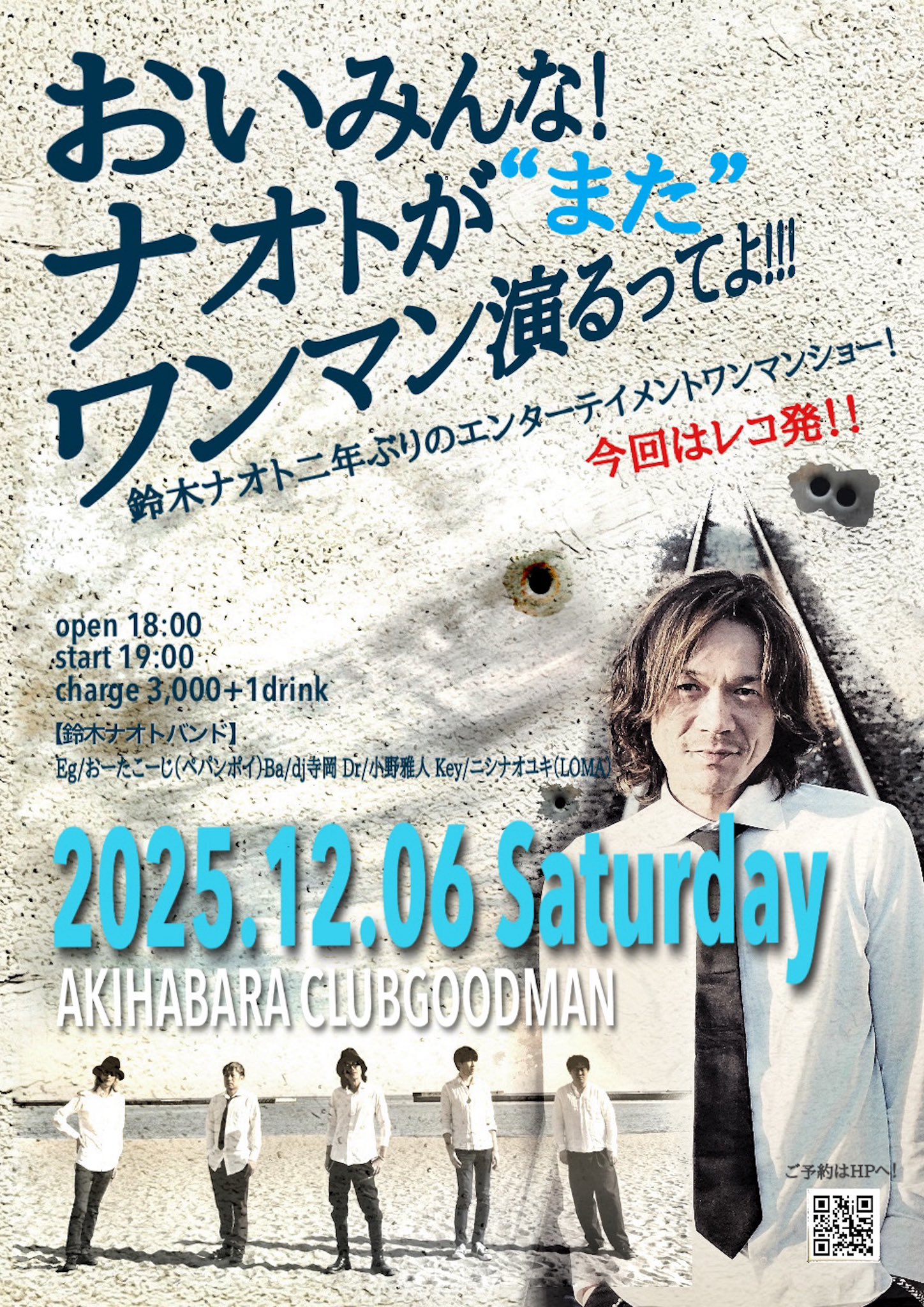 鈴木ナオト二年ぶりのレコ発ワンマンライブ!オーディエンスの皆さまのおかげで満員御礼となった前回を凌げるようなエンターテイメントショーをご用意して、鈴木ナオトはもちろん、ギターのおーたこーじ、ベースのdj寺岡、ドラムの小野雅人、キーボードのニシナオユキ共々ステージで待っております。今回もオールスタンディングでの開催を予定しております。来場してくれた皆さまが元気になって笑顔で帰れますように!皆さまのご来場をお待ちしております!