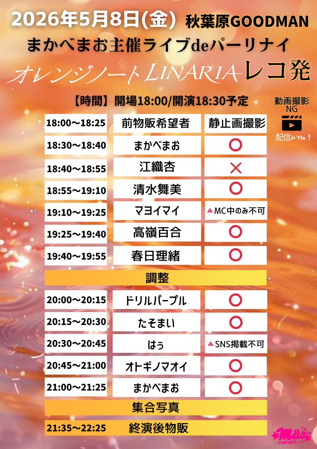 出演者 まかべまお 江織杏 オトギノマオイ 春日理緒 清水舞美 高嶺百合 たそまい ドリルパープル はぅ マヨイマイ OPEN 18:00 / START 18:25 3,000円+D / DD予約+1,000円 / 配信 2,500円*アーカイブ2週間 1ドリンク 600円 アイドル