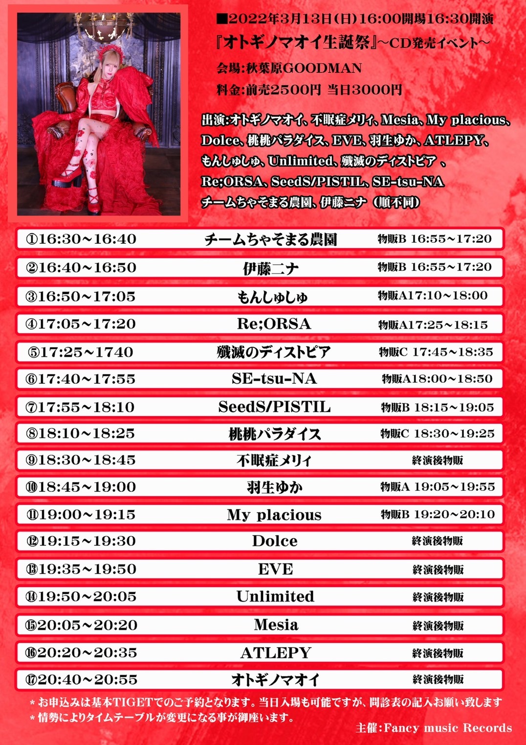 出演者 ATLEPY 伊藤ニナ チームちゃそまる農園 SE-tsu-NA SeedS/PISTIL Re;ORSA 殲滅のディストピア Unlimited もんしゅしゅ オトギノマオイ 羽生ゆか EVE 桃桃パラダイス Dolce My placious Mesia 不眠症メリィ OPEN 16:00 / START 16:30 前売¥2,500 当日¥3,000 ドリンク代別¥600