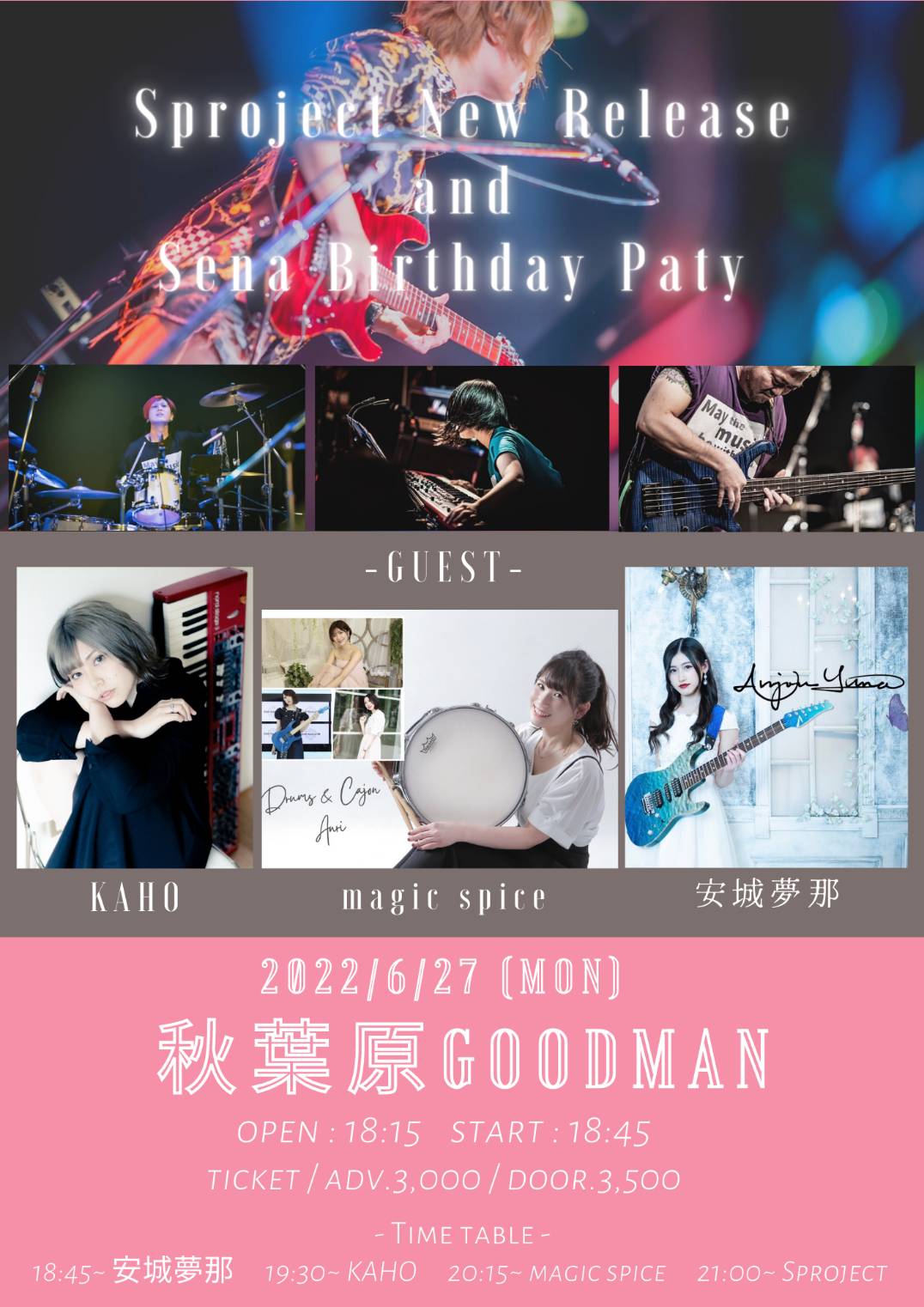 出演者 Sproject KAHO Magic Spice 安城夢那 OPEN 18:15 / START 18:45 予約¥3,000 当日¥3,500 ドリンク代別¥600 配信¥2,500