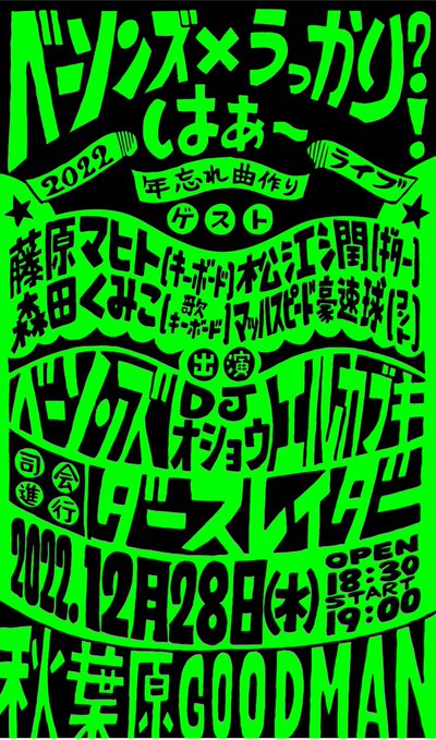 ベーソンズ、そしてDJオショウ、エルカブキとダースレイダーYouTubeチャンネルのレギュラーで一年を振り返りながらトーク、漫才、コント、そしてその場で曲を作るライブをやります!
