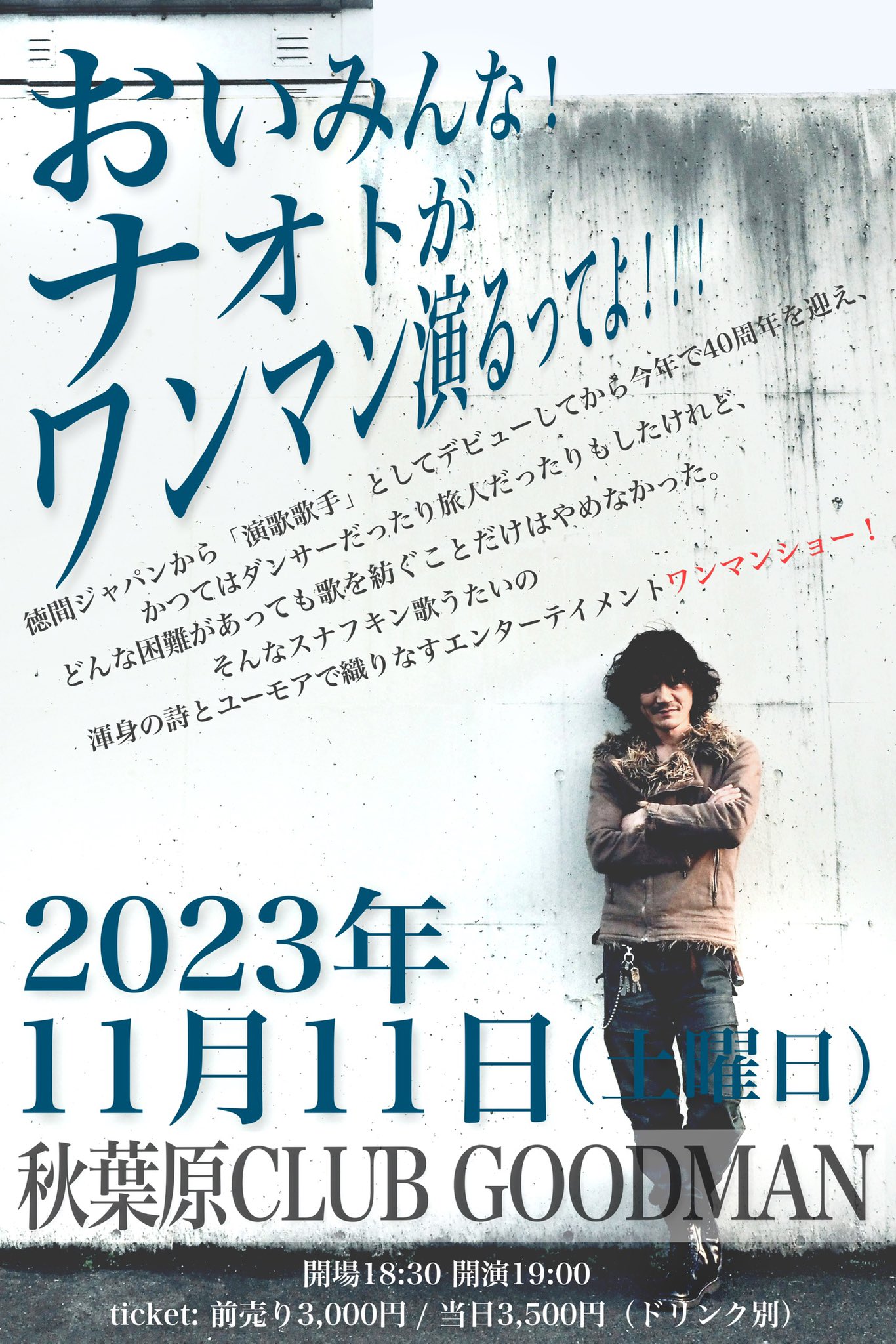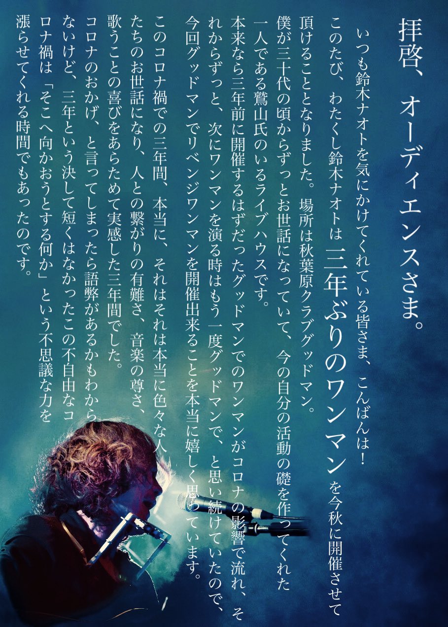 三年前、コロナで幻と化してしまった秋葉原CLUB GOODMANでのワンマンですが、今年の秋、満を持して鈴木ナオト三年ぶりのワンマンです!想いを綴りました。良ければ是非とも一読してもらえたら嬉しい!